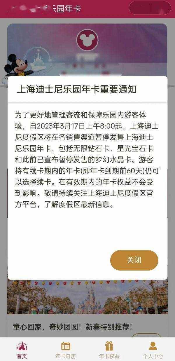 上海迪士尼乐园宣布:为了更好地管理客流和保障乐园内游客体验,自2023年3月17日上午8:00起,上海迪士尼度假区将在各销售渠道暂停发售上海迪士尼乐园年卡,包括无限钻石卡、星光宝石卡和此前已宣布暂停发售的梦幻水晶卡。游客持有续卡期内的年卡(即年卡到期前60天)仍可以选择续卡。在有效期内的年卡权益不会受到影响。