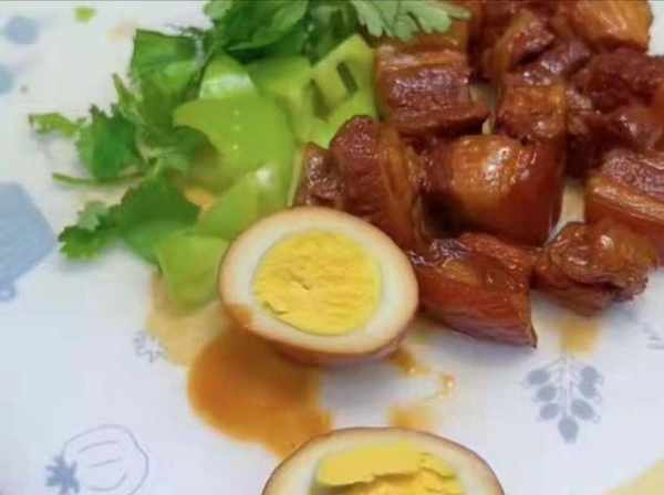 5.五花肉要多炖一会儿,把炖好的五花肉和鸡蛋捞出,洗好香菜,青椒,