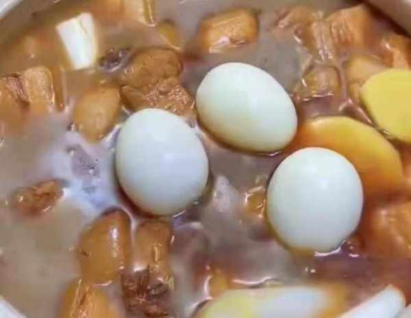 3.把焯水的五花肉放入糖色翻炒均匀,加入生抽,老抽,盐,葱,姜,放入没过肉块的清水,再加几个煮熟的鸡蛋,盖盖小火慢炖,