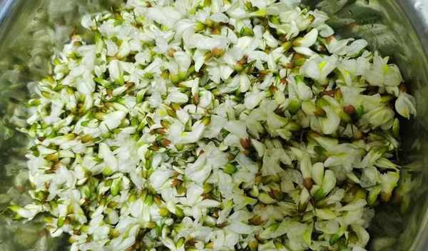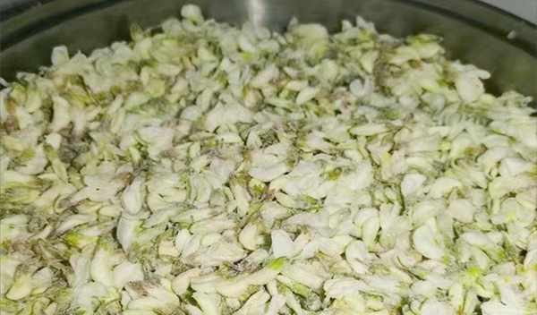 1.槐花摘下来以后把上面的叶片、杂质都挑干净,然后用淡盐水多洗几遍,洗净以后把水分挤干,再淋上植物油拌匀,提前拌上油能防止蒸出来粘连、坨块。