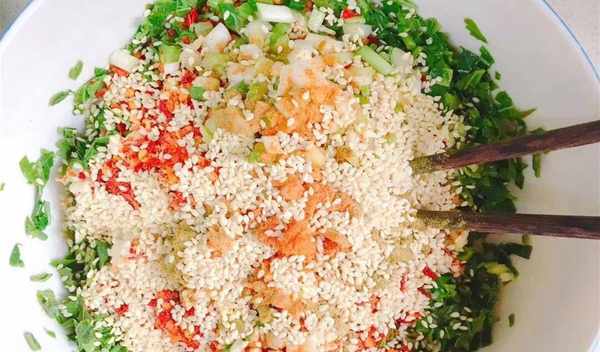 3.锅内多烧点油,油温升至200度时起锅,浇在芝麻上面把香味激发出来,然后拌匀就可以了。冷却以后装在保鲜罐里,淋上香油封口,随时吃随时拿,再也不用担心没菜吃。