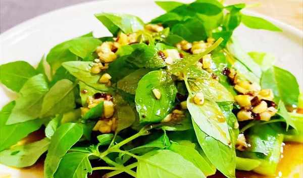 3.然后加入食盐、少许糖提鲜、生抽、陈醋、芝麻香油,喜欢吃辣的再来点辣椒红油,把荆菜叶放进去,翻拌均匀后即可装盘上桌。
