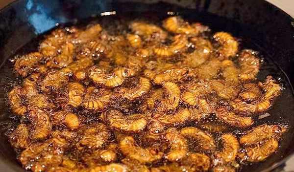 2.锅里烧油,油温五成热时把腌好的爬蚱沥干料汁放入锅中,中小火慢慢地炸,经常翻动、确保每一只爬蚱都能炸熟。一直炸至表面金黄、爬蚱都翻过来就可以了。