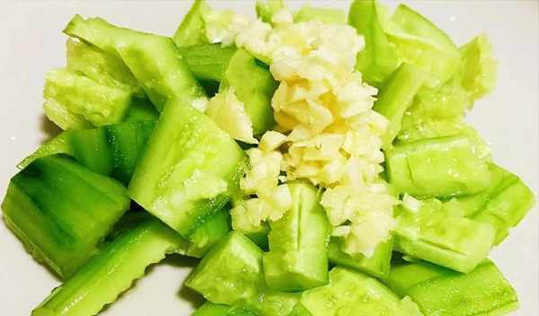 2.黄瓜削去外皮,先拍扁、再切成小块;凉拌菜没有蒜香味少一半,蒜末可以多准备点。