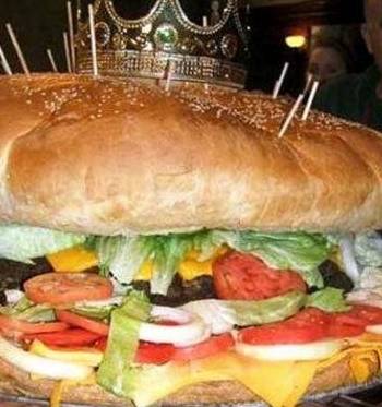下面我们来看一下“世界之最”的食物。世界上最大的汉堡:这个巨型汉堡叫做“Ye_Olde_96er”,在宾夕法尼亚州的一个酒吧里它售价是12.95欧元。“大块头”汉堡里夹着一块6磅厚厚的牛肉片、一片5磅的干酪,在最顶上还插着一个巨大的圆面包