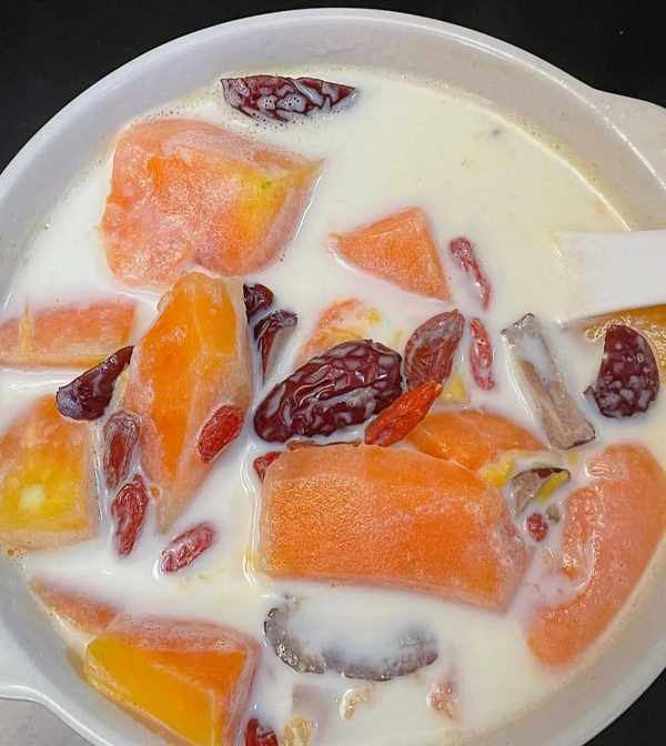 用料:熟透的木瓜2个,鲜牛奶500 毫升,红枣、枸杞、白砂糖适量制法:①木瓜洗净,去皮、籽,切细丝。② 木瓜丝放入锅内,加水、白砂糖熬煮至木瓜熟烂。 注入鲜奶调匀,再煮至汤微沸即可。