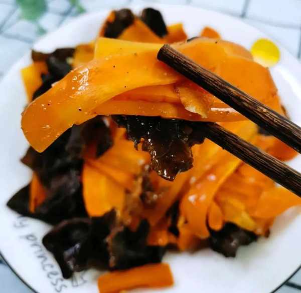 3.加木耳和适量清水烧至胡萝卜丝熟透,用盐和鸡精调味即可。