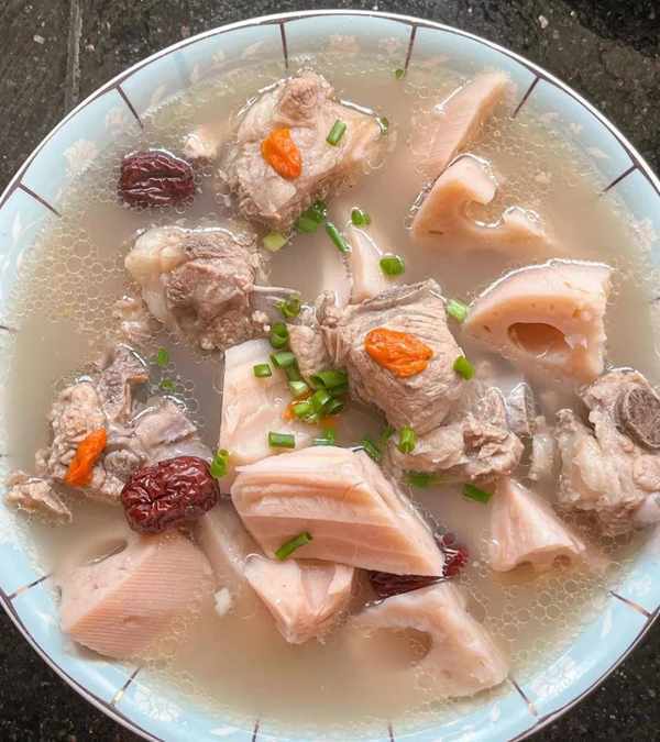 将莲藕去皮,洗净,切成大块;排骨洗净,砍成段。锅中加水烧沸,下入排骨汆去血水后,捞出沥干。莲藕与排骨、红枣、枸杞一起放入瓦罐中,加适量清水,大火炖35分钟,加盐、味精调味即可。