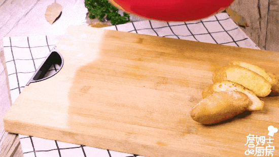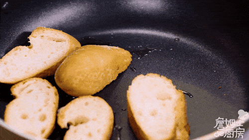 将法棍切厚片,锅中倒入橄榄油将法棍放入煎至金黄焦脆,撒上盐和黑胡椒调味。