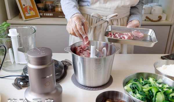 4、猪肉切大块放入九阳和面绞肉机-饺子神器pro中,绞肉的钢杯容量有3升,一斤肉放进去也就不到一半的位置。