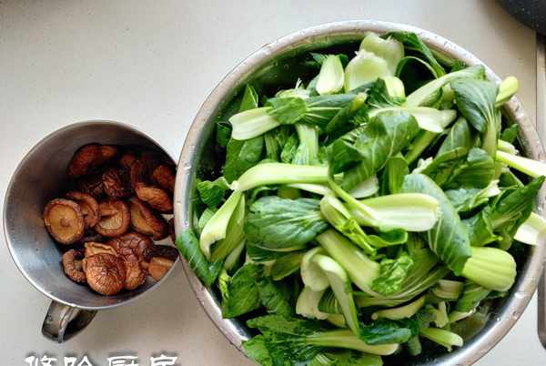 2、油菜分批开水焯烫15秒后捞出,放入冰水中过凉,烫油菜的水中放几滴植物油,保持油菜翠绿。香菇也要焯水。