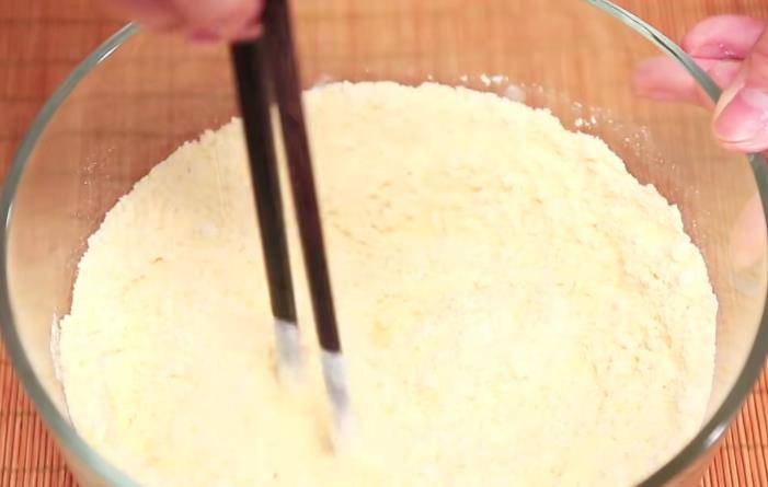 首先准备一个大碗,依次加入泡打粉,玉米面,面粉,黄豆粉,用筷子均匀搅拌;