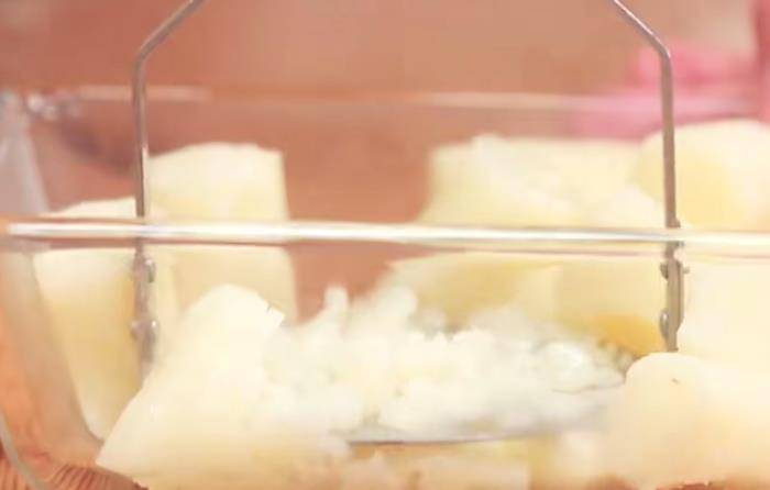 之后把蒸熟的山药倒入一个容器中,先用工具碾压成泥,然后倒入蜂蜜搅拌均匀。