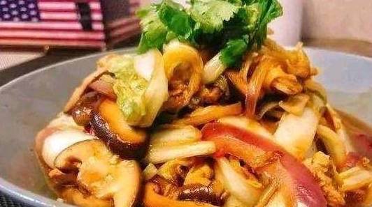 2、炒锅中入少许油,把五花肉薄片炒香之后依次加入葱姜蒜,辣椒,香菇丁略炒片刻。