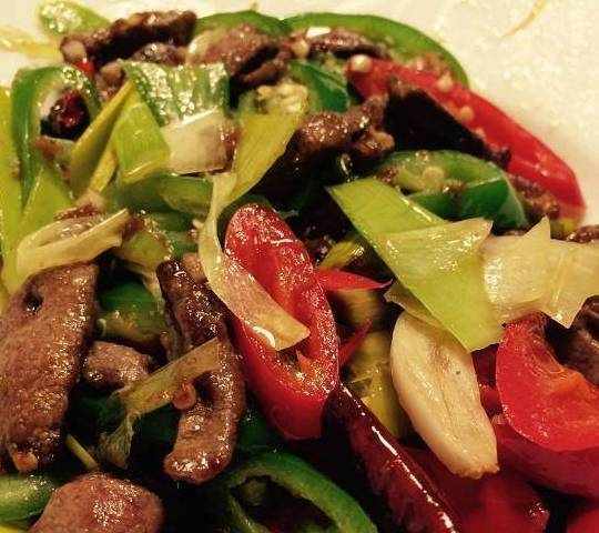 6.再次加入适量的橄榄油,放入花椒干辣椒炒出香味时加入猪肝爆炒,在猪肝熟后加入炒好的辣椒,翻炒几下,起锅,装盘。