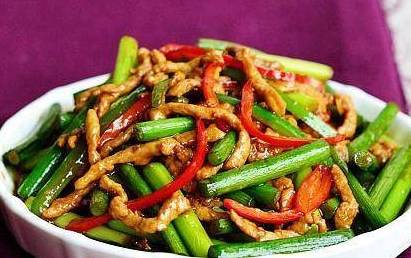 用料:蒜苔200克、猪肉200克、红椒1个、柿子椒1个、花生油适量、食盐适量、姜1块、蒜2粒、生抽1.5汤匙、老抽1茶匙、生粉1茶匙、黄酒2茶匙、白糖1/2茶匙