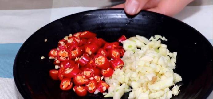 6、香菜完全晾干水分之后,咱们将其取出来,先将它切成小段,然后把它放到一个碗中,将小米辣和蒜末倒进去,戴上一次性手套将它们抓拌均匀。接下来再将它们放在玻璃瓶中,然后倒入晾凉的料汁,密封好,冷藏腌制1~2天即可食用。