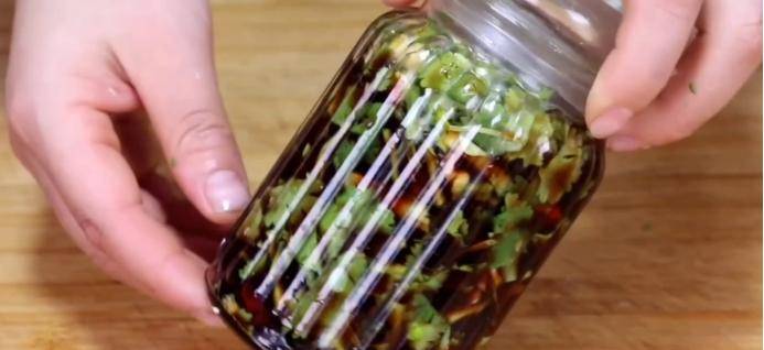 5、准备一个可以密封的玻璃瓶子,先向里面倒入咱们准备好的高度白酒将其清洗一遍。倒入白酒之后,咱们盖上玻璃瓶的盖子,然后摇晃几下,再将白酒倒出来就可以了,白酒能够杀菌消毒。接下来再把小米辣切碎,大蒜切末,全部切好之后,将它们放到一个盘中备用。