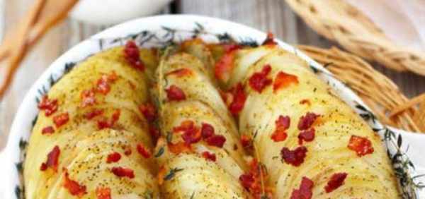 4.把切好的培根排在土豆中间,撒上盐和胡椒粉,放入烤箱烤10分钟左右。