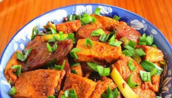 材料:千叶豆腐、香肠、青蒜、油、糖、豆豉、姜片、蒜、酱油