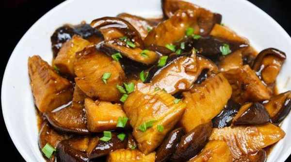 材料:冬笋300克,香菇100克,姜适量,葱白适量,白糖少许,酱油适量,盐少许,水淀粉适量