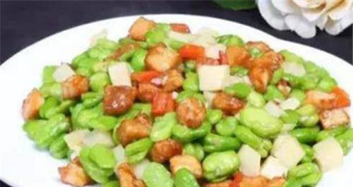 3.将春笋切丁连同鲜豆和红辣椒一起放入锅中,捞出晾干待用;