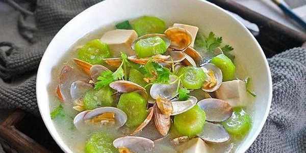 材料:文蛤300克、嫩豆腐1块、丝瓜1片、蒜头2粒、姜末3克、葱1棵、盐少许