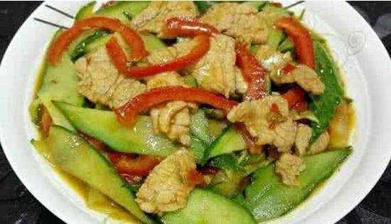 2、黄瓜切片,红辣椒切丁;3、热锅油烧热,将肉片炒至七熟盛出;