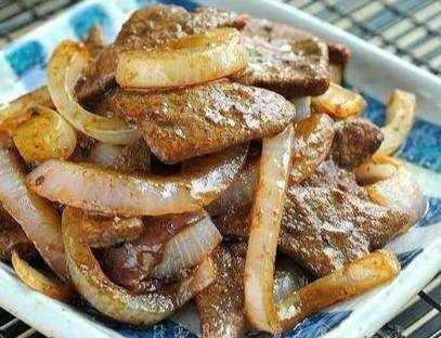 5、锅洗净,烧热倒入少许油,倒入洋葱炒一分钟左右至变软;加入一大勺黑胡椒汁,搅拌均匀,马上倒入炸好的猪肝,搅拌均匀即可出锅上桌。