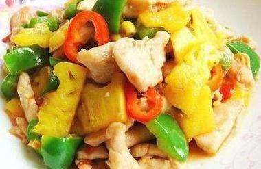 4、锅内再次加油,放入压好的蒜片炒香,加入切碎的西红柿边炒边炒出红油;加入青红椒翻炒片刻,加入菠萝丁和鸡片翻炒均匀;加入生抽、盐、糖、鸡精,拌匀即可食用。