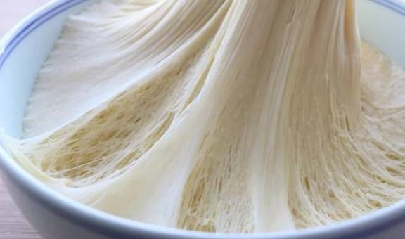 第二步为:放在冰箱冷藏发酵一个晚上,发酵以后,拉开面团看,拉丝状态超级好。
