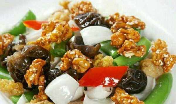 材料:百合50克,蜜豆150克,泡香菇50克,红辣椒20克,核桃仁100克