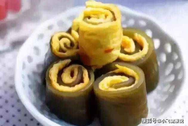 5.紫菜煮软后取出,将煎蛋放在上面,切成与紫菜一样大小的正方形。