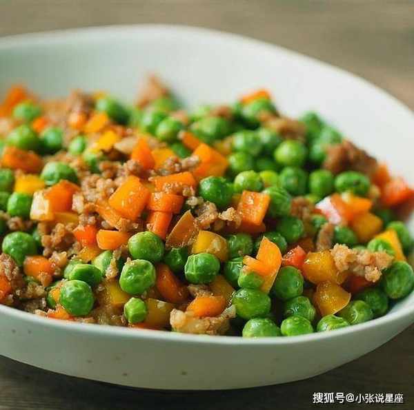 做法:1.豌豆去皮,胡萝卜切成豌豆大小的方块;