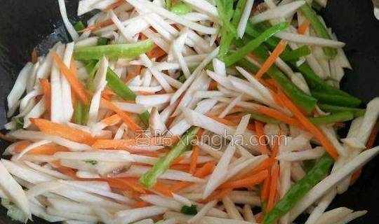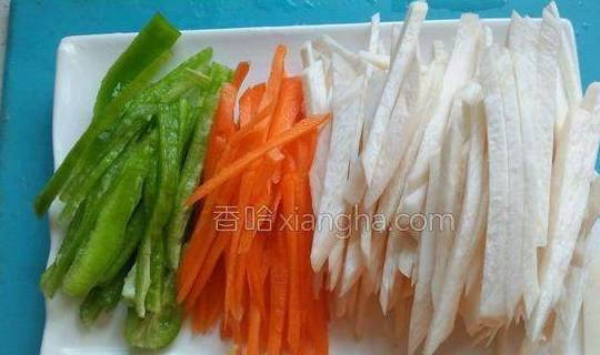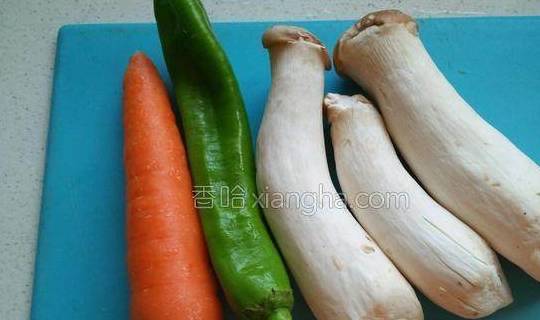 2.青椒,胡萝卜,杏鲍菇,所有食材切丝备用