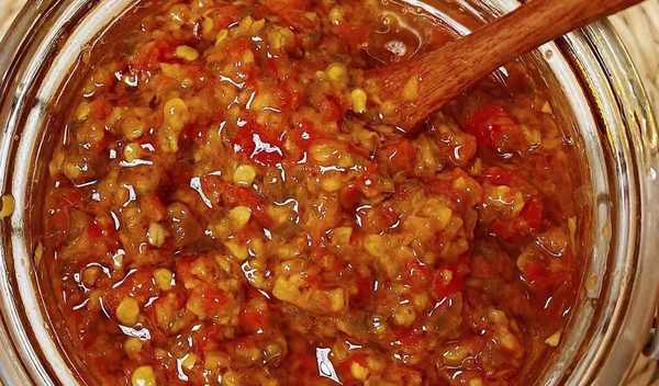 2、热油中放一瓶黄豆酱炒出香味,放打碎的辣椒慢火炒出红油,加入盐,味极鲜,蚝油,白糖调味,小火炒30分钟,此处需要不停搅拌