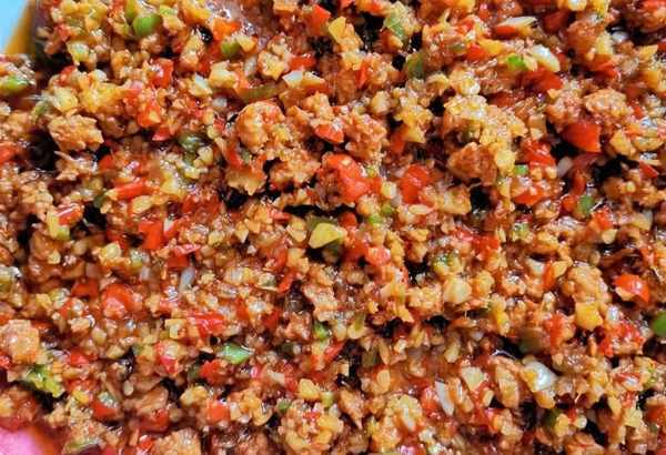 食材部分:牛霖肉一斤半(剔净筋膜切丁),杏鲍菇一两颗切丁,蒜粒150克绞肉机搅碎,清水浸泡一下放漏勺沥干,挤干水分,生姜100克绞肉机搅碎,新鲜小米辣300克搅碎