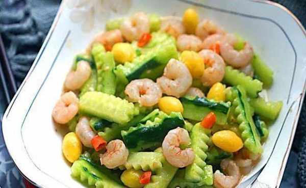 材料:虾、黄瓜、白果、红辣椒、盐、水淀粉、姜、蒜