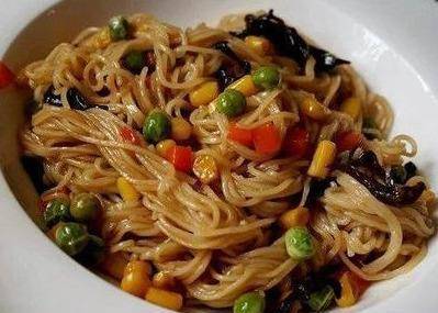 3、热锅放入胡萝卜和青豆翻炒1分钟,再加入玉米和木耳翻炒1分钟;锅中加入水、盐、生抽、油半小碗搅匀,倒入鱼。对于面条,盖上锅盖,用文火煮约2分钟。揭开盖子,用筷子在面条上划动,使面条与配料混合均匀,然后加热收汁。