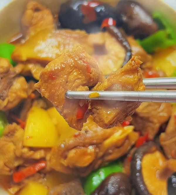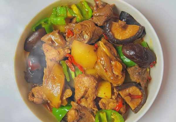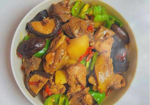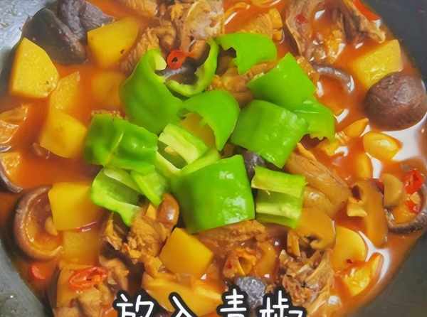 7:最后放入一些青椒块或红辣椒,迅速翻炒均匀,等待鸡肉煮至软烂,尝一尝鸡肉的咸淡,适当添加一些食盐和胡椒粉,大火收汁,出锅,这道香菇土豆焖鸡就可以开吃了,鸡肉软烂入味,汁水十分丰富,怎么吃都不会腻。
