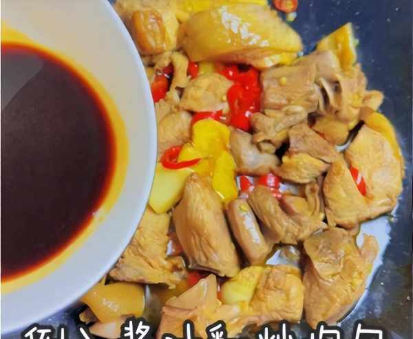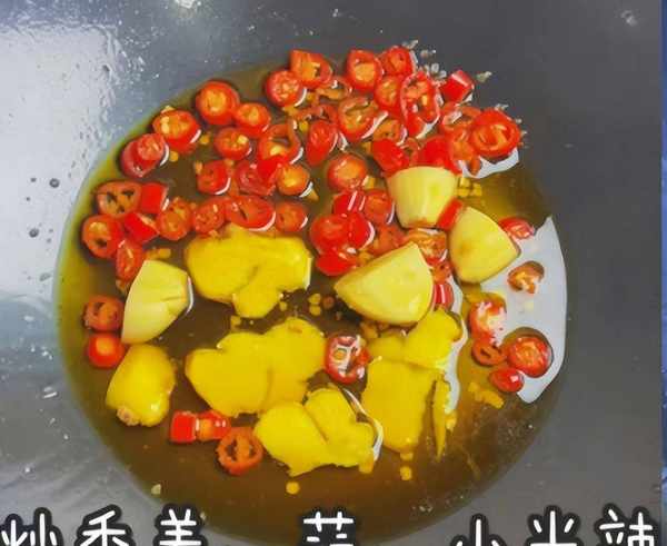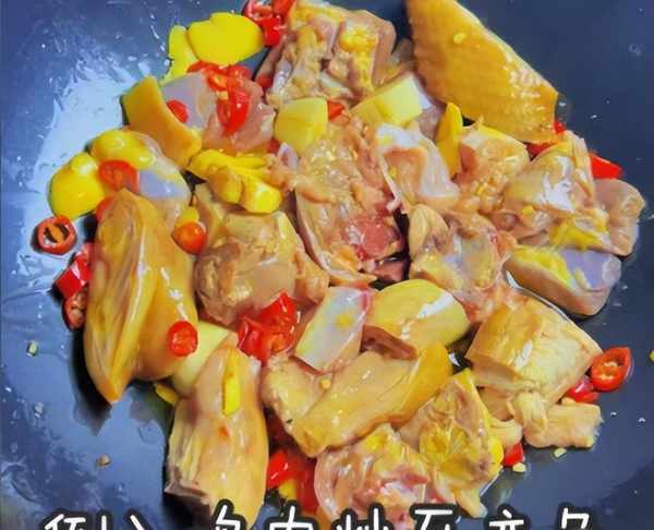 5:锅底烧热加上菜籽油,油温烧热放入小米辣和姜片,蒜片,迅速煸炒一会儿,倒入焯水好的鸡肉,快速煸炒至变色。