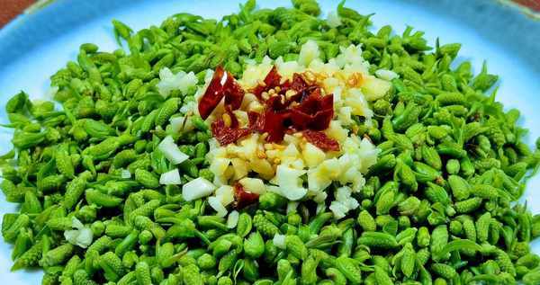 2、取一些蒜瓣,去皮,切成蒜粒,取一些干红辣椒,洗净,切成小块。把柳树芽泡好,沥干水,装进盆里,给孙子抹上大蒜。