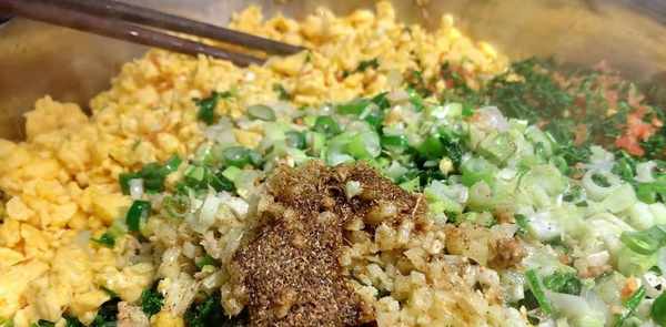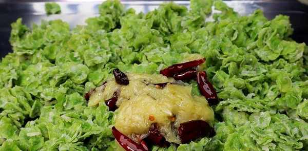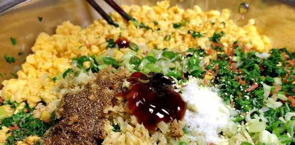 紫花苜蓿挤出多余水分,切碎,放入大锅中,加入切碎的胡萝卜、切碎的鸡蛋、切好的葱姜、两勺五香粉,淋上辣椒油即可。激发香料的香气。