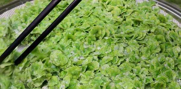 把锅里的水烧开。水开后加一勺盐增加底味,再加入少量食用油。将洗净的牧羊袋在水中漂白约10分钟。1分钟。然后取出检查水份,放入冷水中冷却。