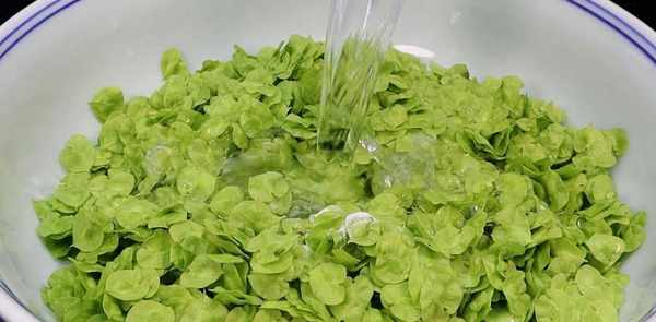 将处理好的榆钱放在一个大碗里,加入一勺盐,一勺小苏打,然后加入没没过榆钱的清水,将榆钱清洗干净。先放入沥水篮,控制湿度