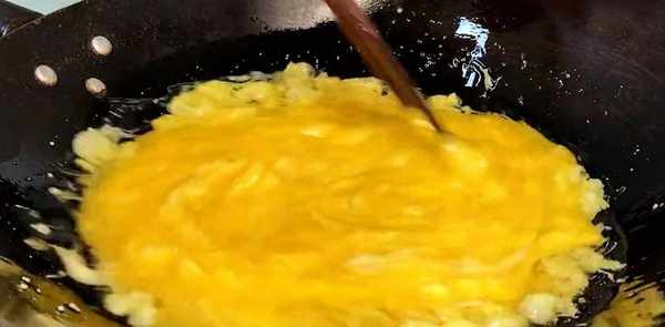 翻面,用锅铲捣碎,煮至蛋液凝固。