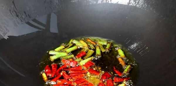 锅内油热后,放入葱段爆香。葱段入锅后关火,加入花椒段,用余热将花椒炒香。