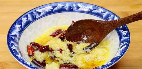将大蒜捣成蒜泥,放入小碗中,加入一勺盐,一勺鸡精,适量香油,最后一勺葱油和辣椒拌匀。