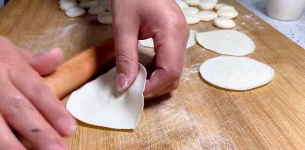 放入适量的馅料,然后对折,用两个拇指按住两端,用力挤压,饺子就包好了。
