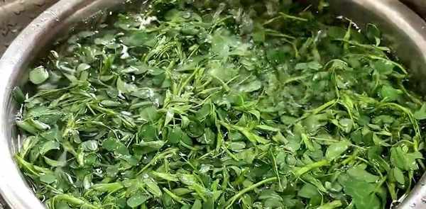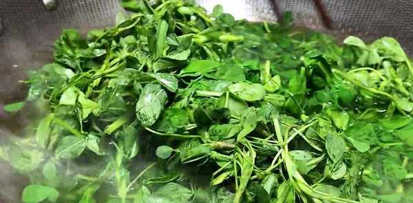 锅中水再次烧开,将紫花苜蓿放入水中焯水30秒,将焯好的紫花苜蓿放入冷水盆中晾凉备用